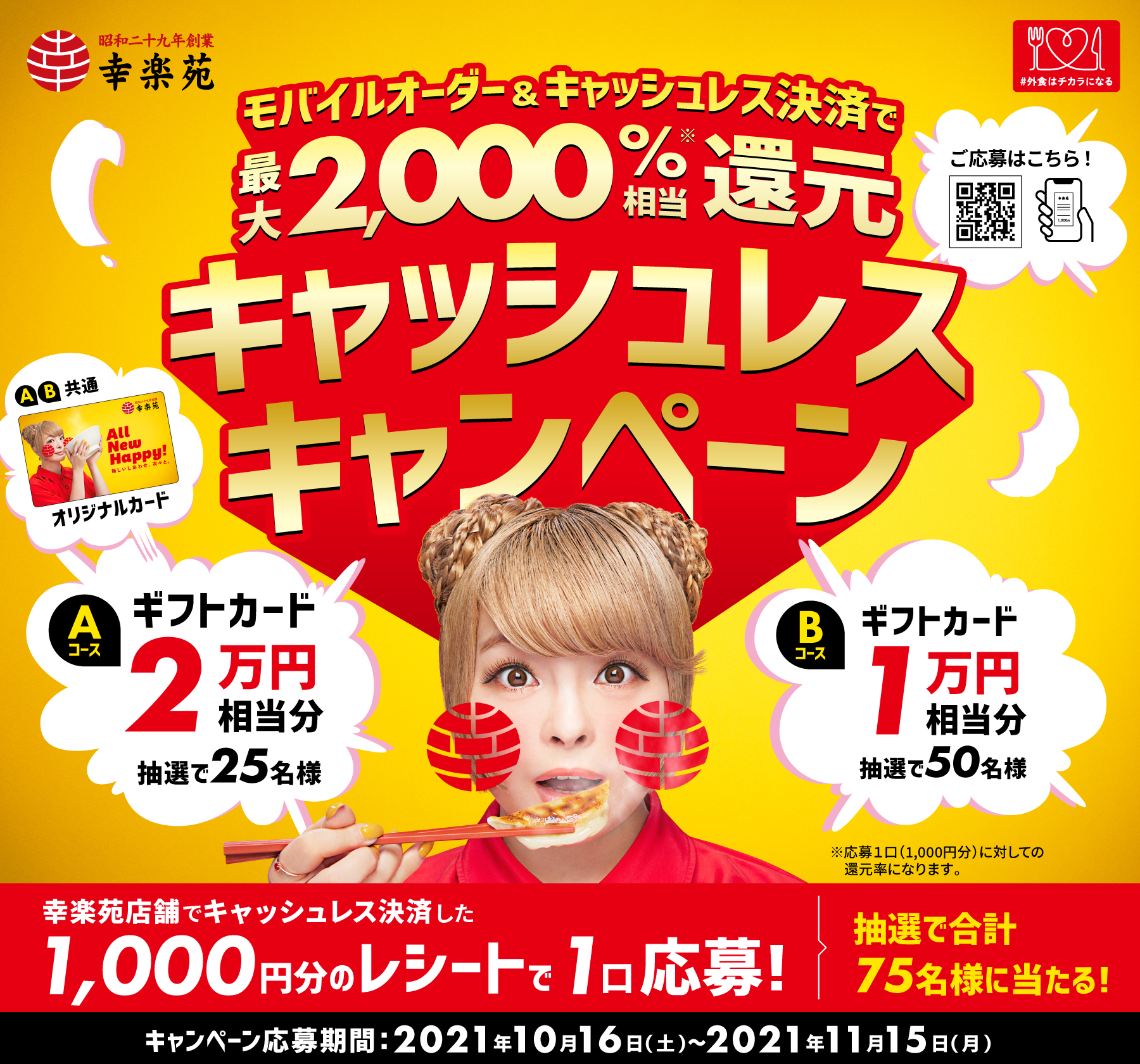 モバイルオーダー&キャッシュレス決済で最大2,000%相当還元 幸楽苑「キャッシュレスキャンペーン」実施が決定!