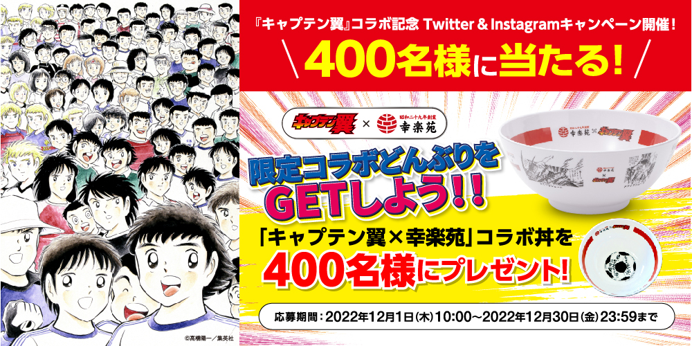 「キャプテン翼×幸楽苑」コラボ 第2弾 幅広い世代に人気の『キャプテン翼』と再びコラボ! 多くのお客様にご来店いただくと共にスポーツを愛する皆様を応援します!