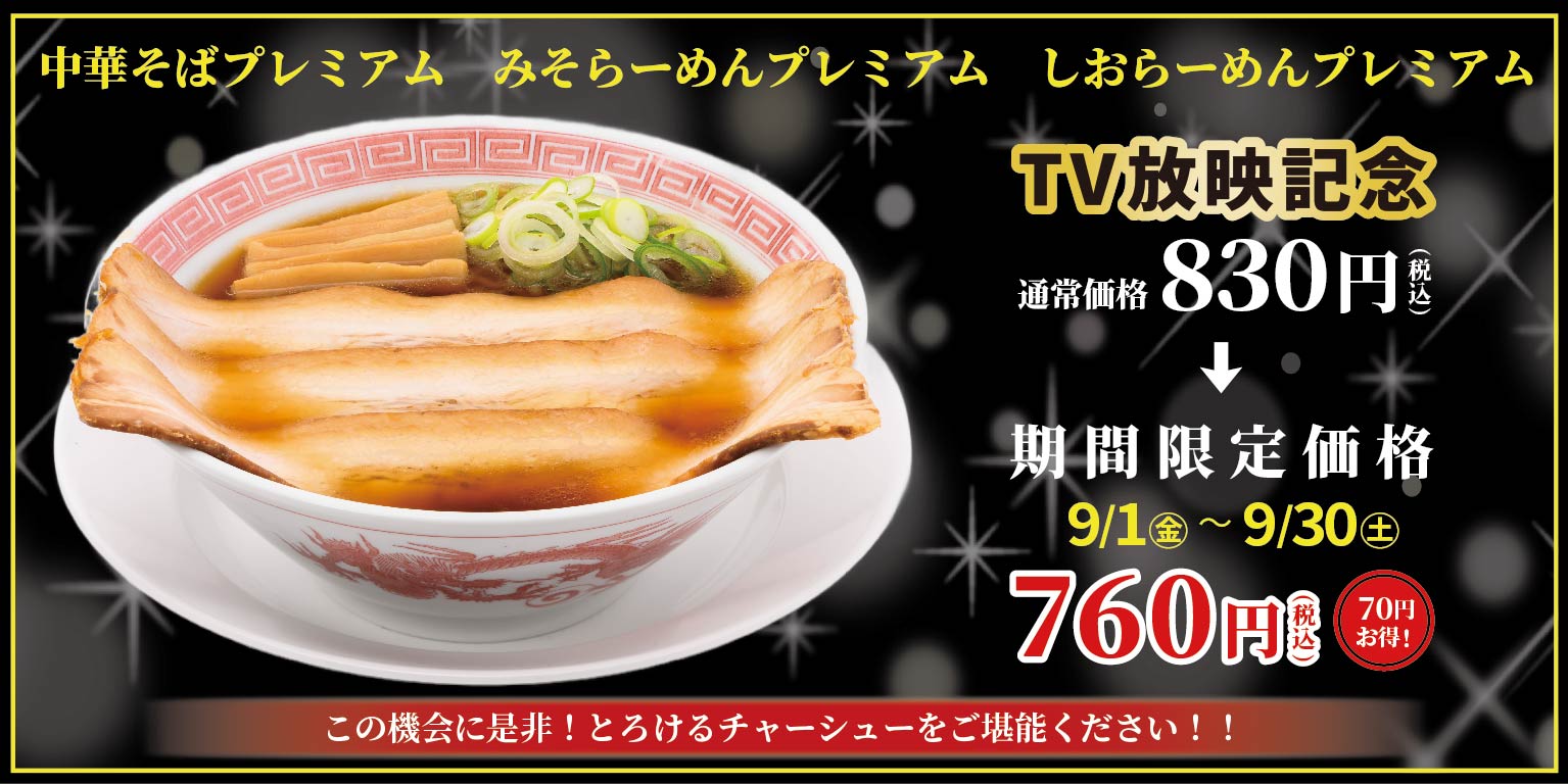 フジテレビ系列「ウワサのお客さま」放映記念!中華そばプレミアム(醤油・味噌、塩味)を通常価格830円のところ、特別価格760円で販売。9/30(土)まで!!