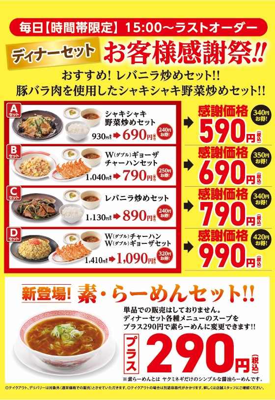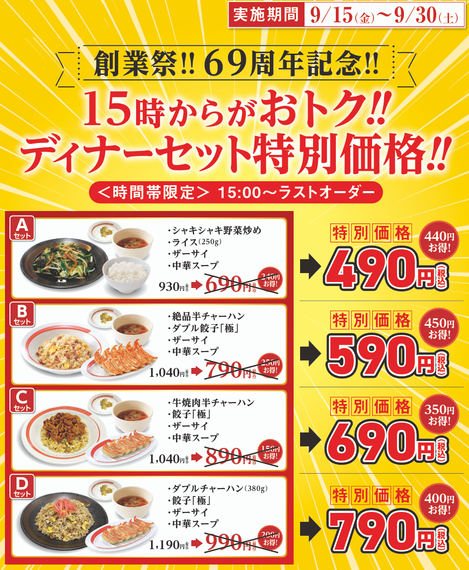 創業祭!69周年記念! 15時からがおトク!! 時間帯限定メニュー「ディナーセット」を特別価格で販売!!2023年9月15日(金)から9月30日(土)まで!