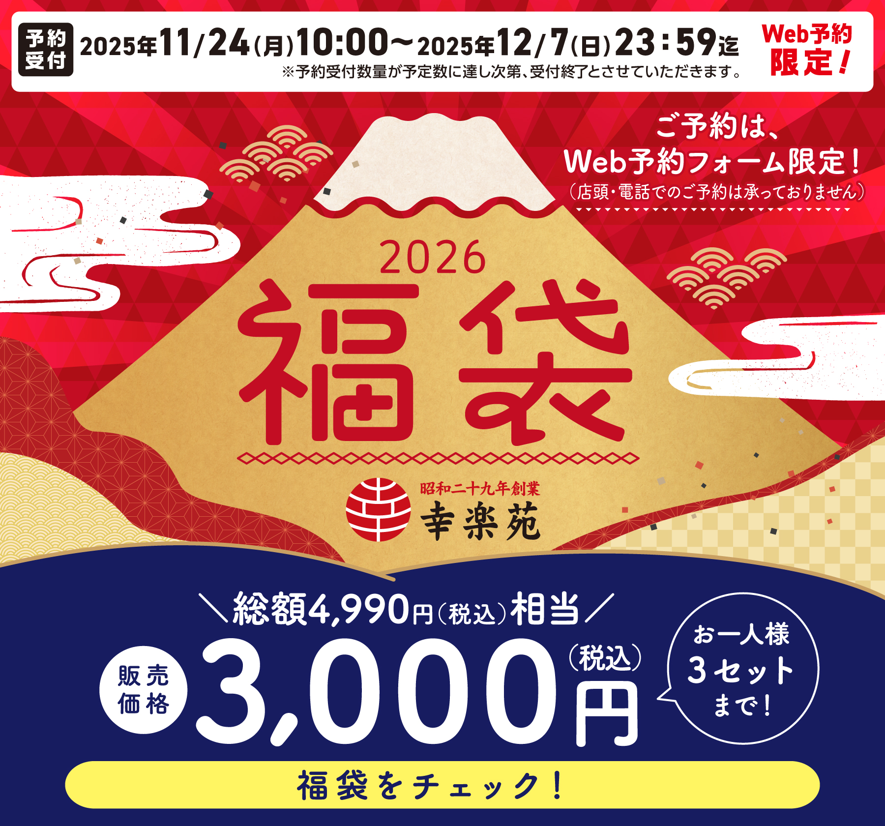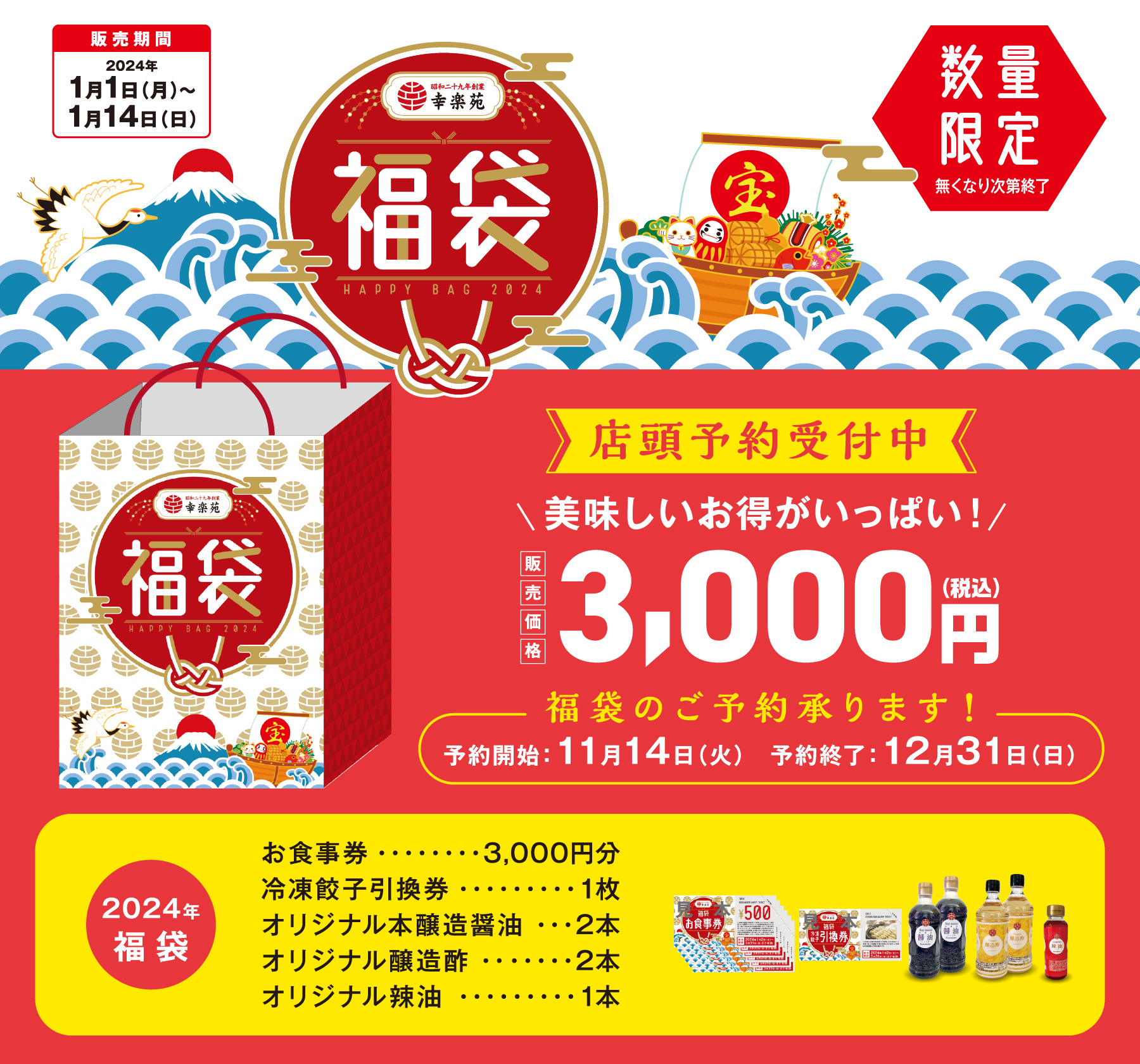2024年元旦~お得な「幸楽苑の福袋」を3,000円(税込)で販売!幸楽苑各店で予約受付中!2023年12月31日(日)迄!