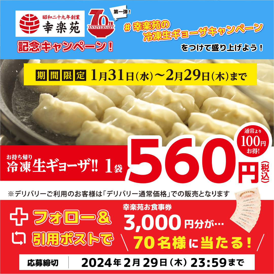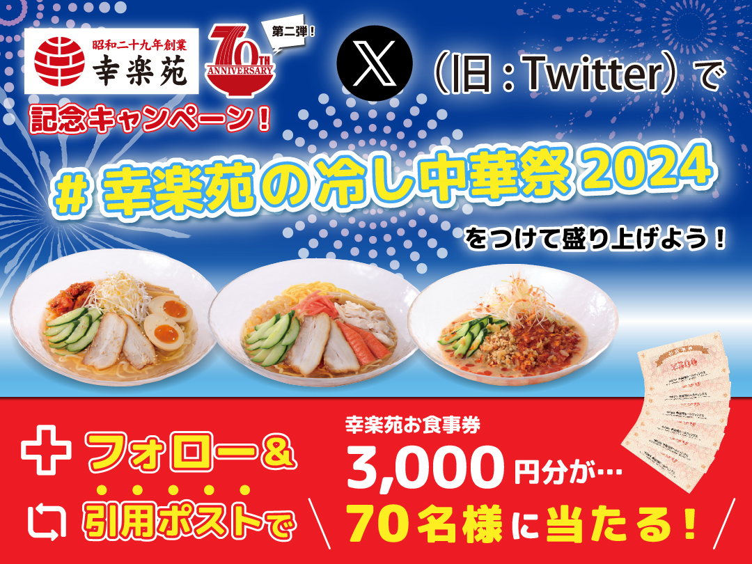 幸楽苑70周年記念 第二弾X(旧Twitter)キャンペーン!! 70名様に3,000円分のお食事券プレゼント!!