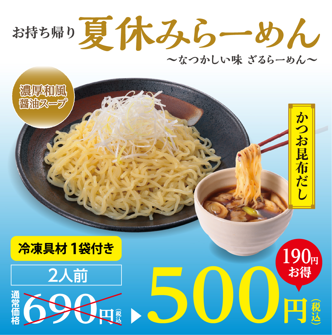 お持ち帰り「夏休みらーめん」特別価格!7月22日(月)~8月25日(日)まで500円(税込)!