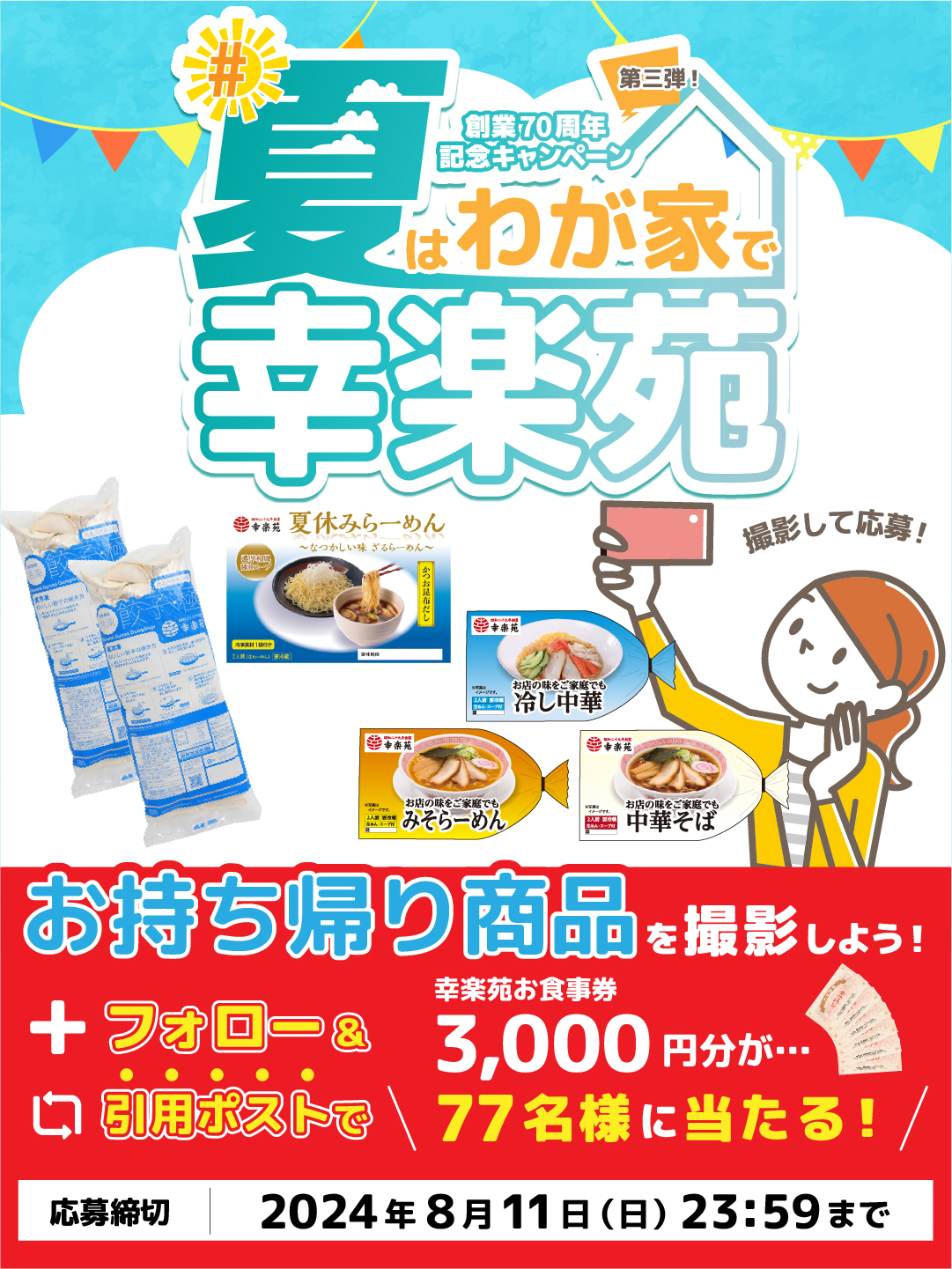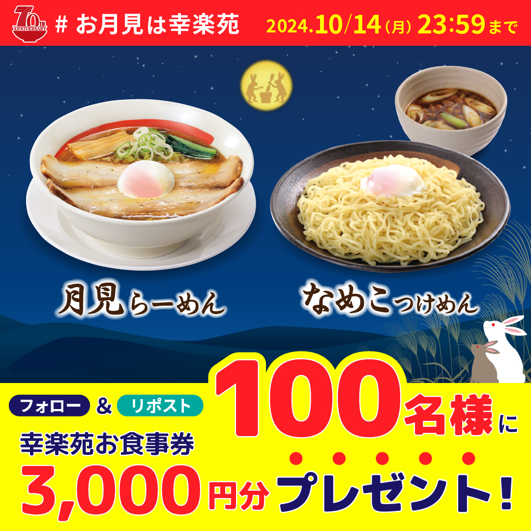 幸楽苑70周年記念 第三弾X(旧Twitter)キャンペーン!! 77名様に3,000円分のお食事券プレゼント!!