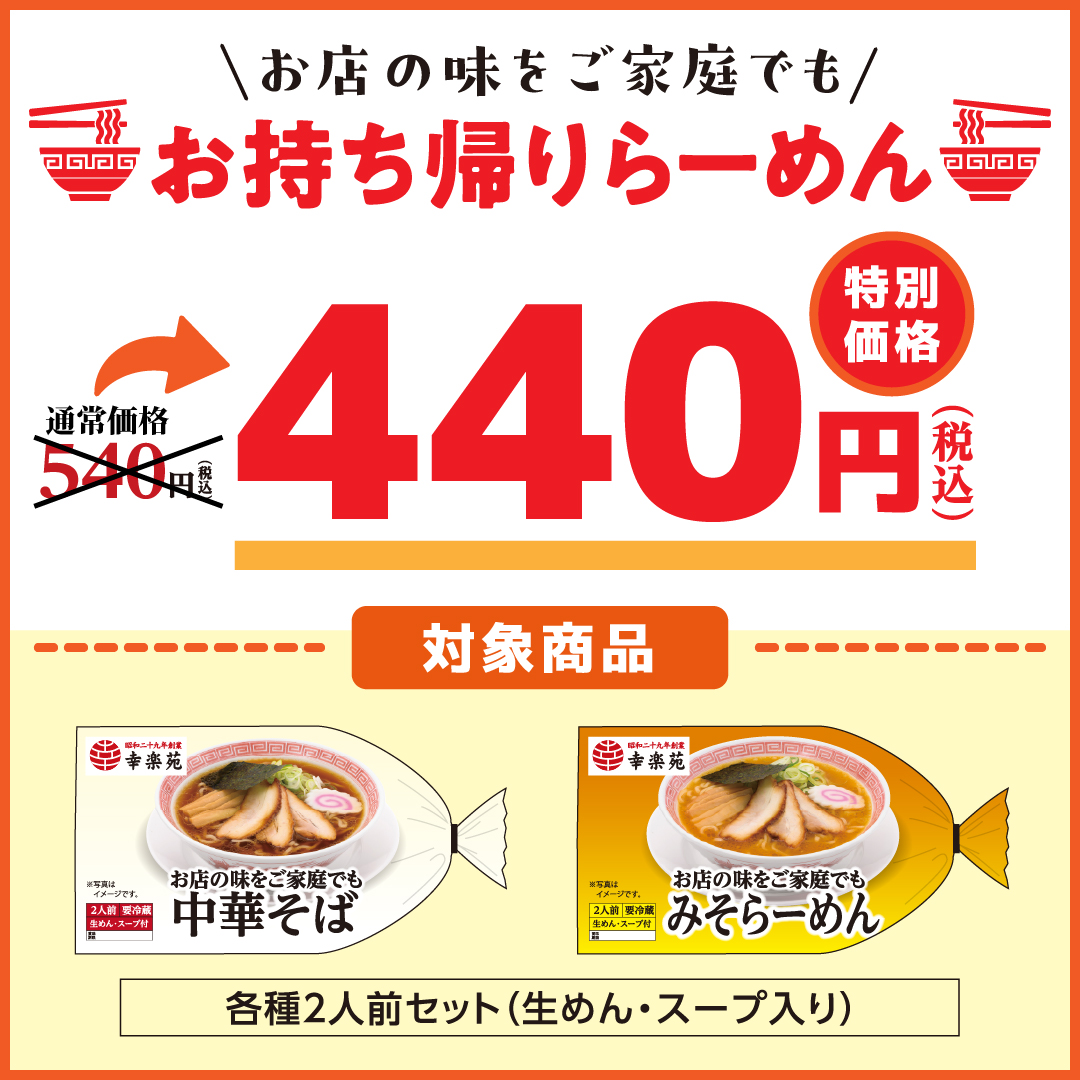 お持ち帰りらーめん特別価格!!7 月22日(月)~8月25日(日)まで100円引き!