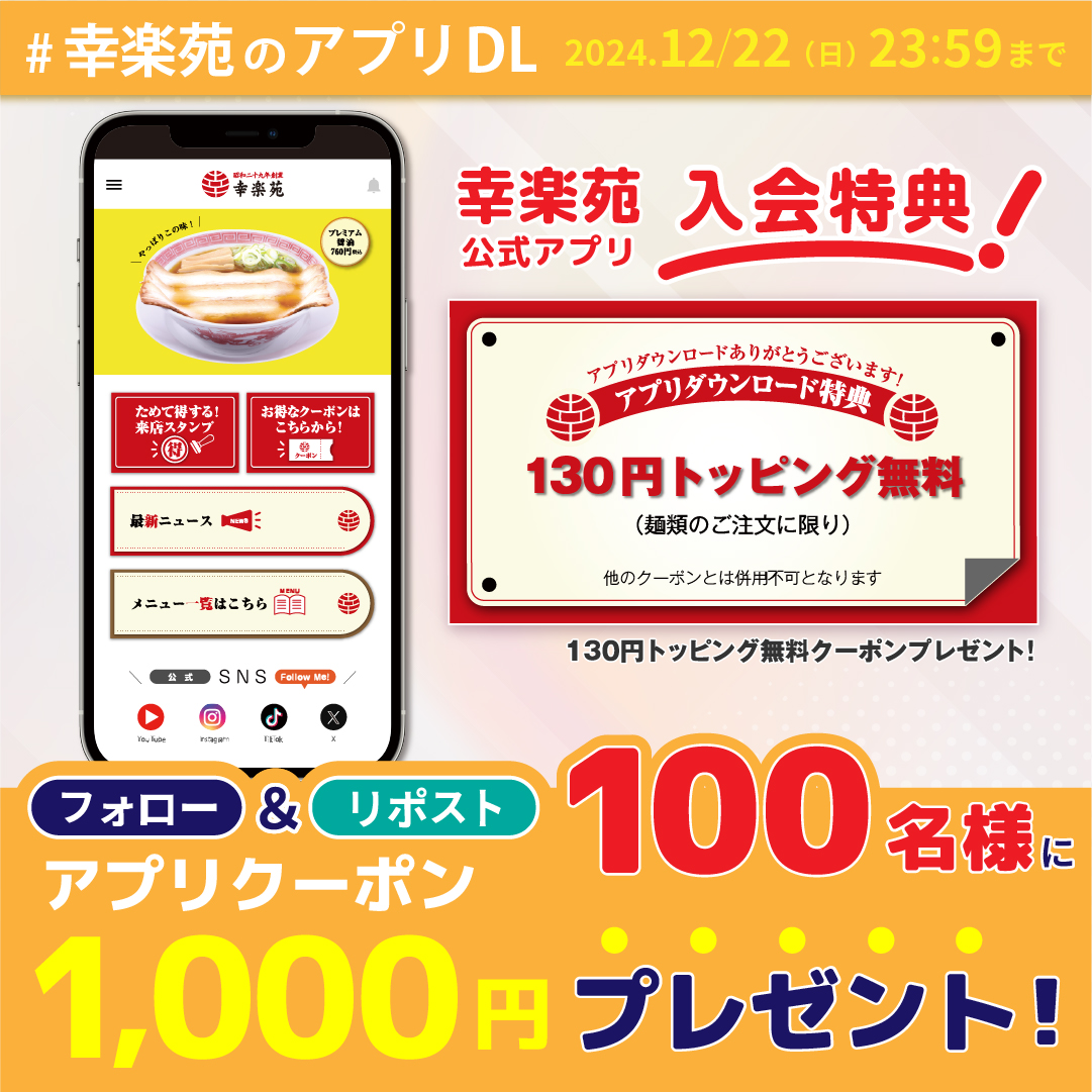 100名様にアプリクーポン1,000円分が当たるXキャンペーン 2024年12月16日(月)~12月22日(日)まで開催!!