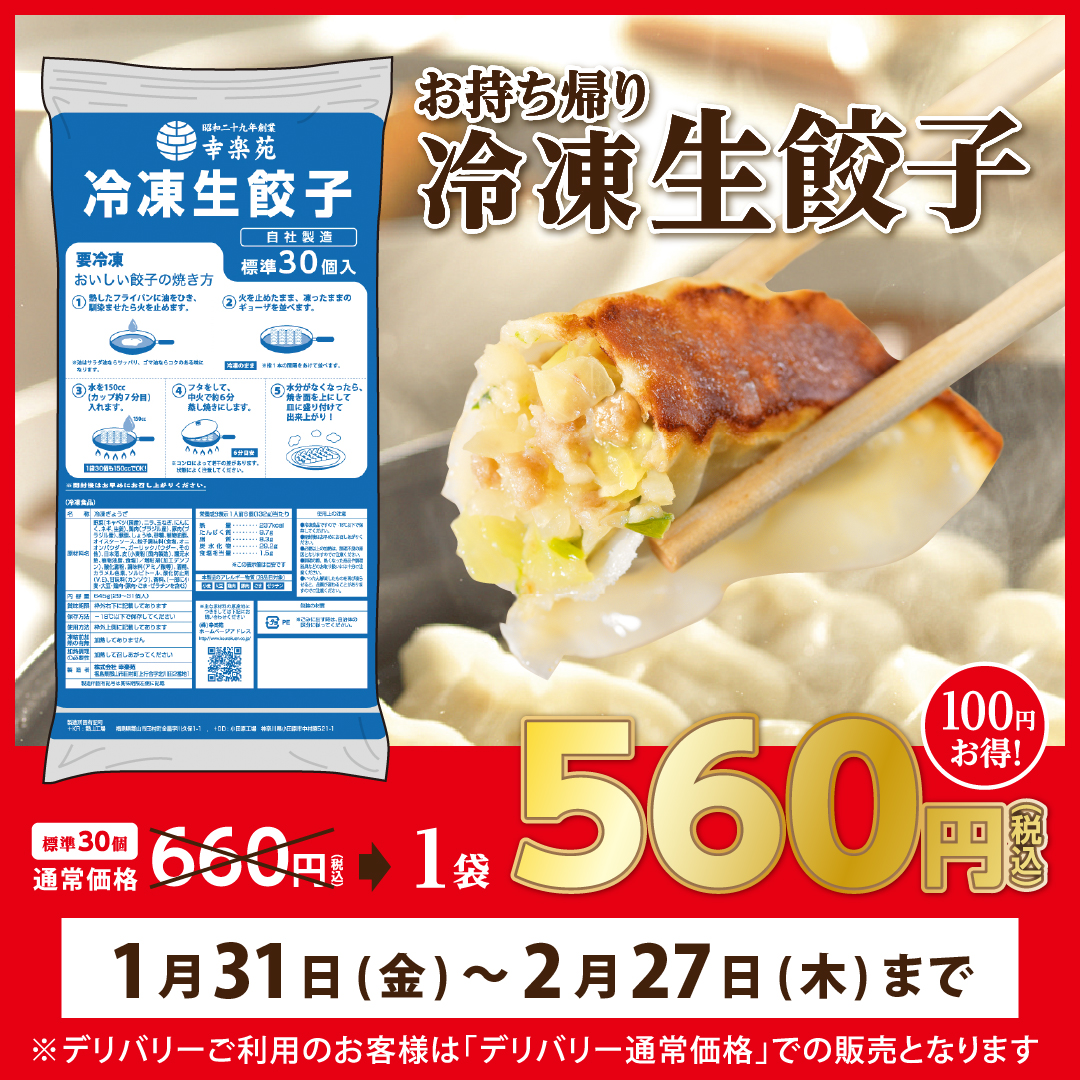 1月31日(金)~2月27日(木)まで期間限定!お持ち帰り「冷凍生餃子」 特別価格560円(税込)にて販売開始!