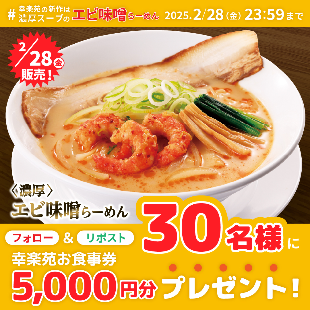 30名様に幸楽苑のお食事券5,000円分が当たるXキャンペーン2月15日(土)~2月28日(金)まで開催!
