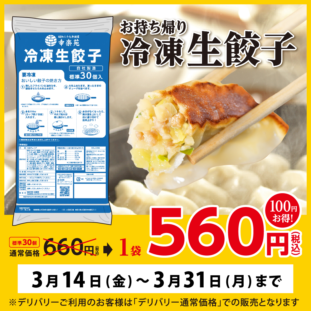 3月31日(月)まで期間限定!お持ち帰り「冷凍生餃子」 特別価格560円(税込)にて販売開始!