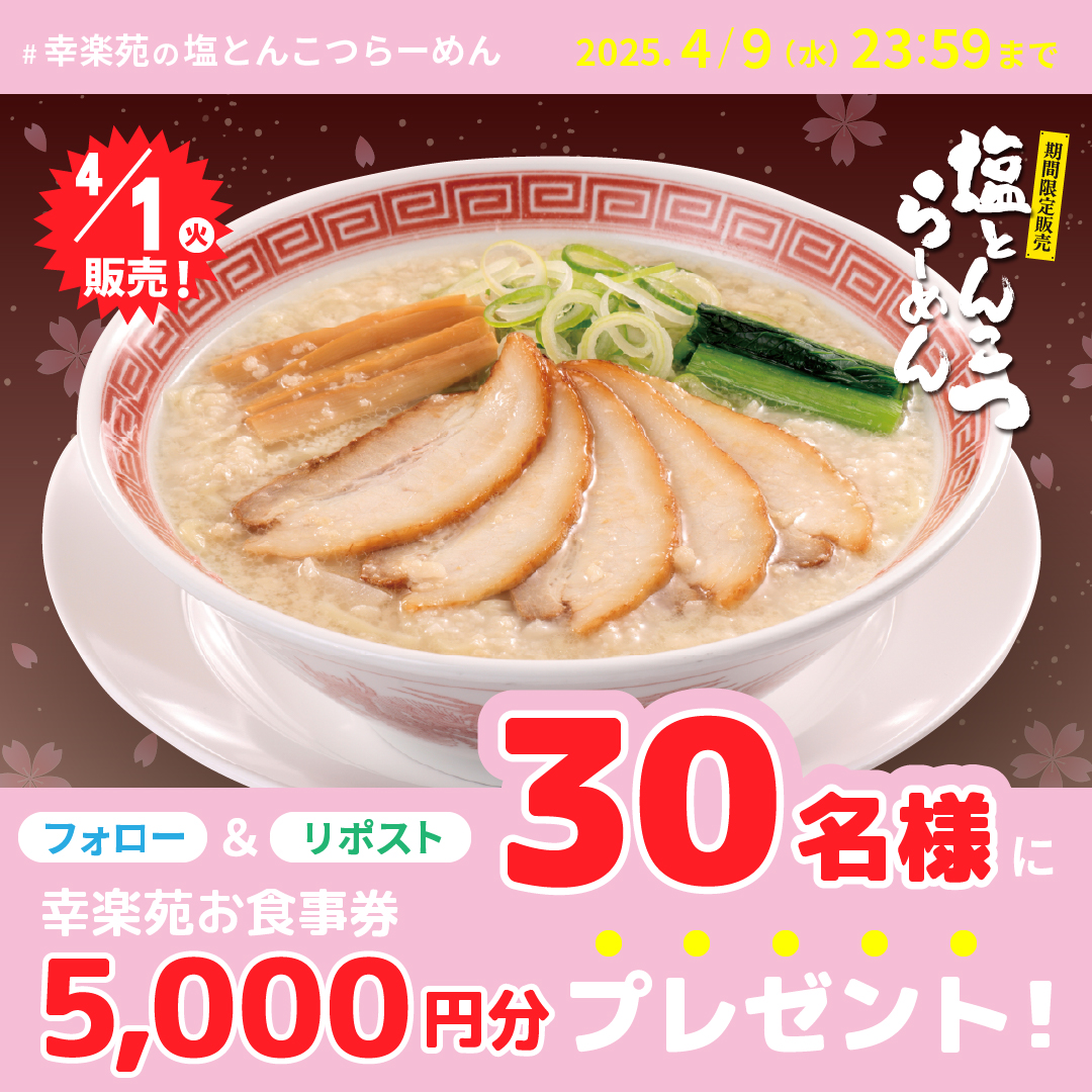 30名様に幸楽苑のお食事券5,000円分が当たるXキャンペーン3月27日(木)~4月9日(水)まで開催!