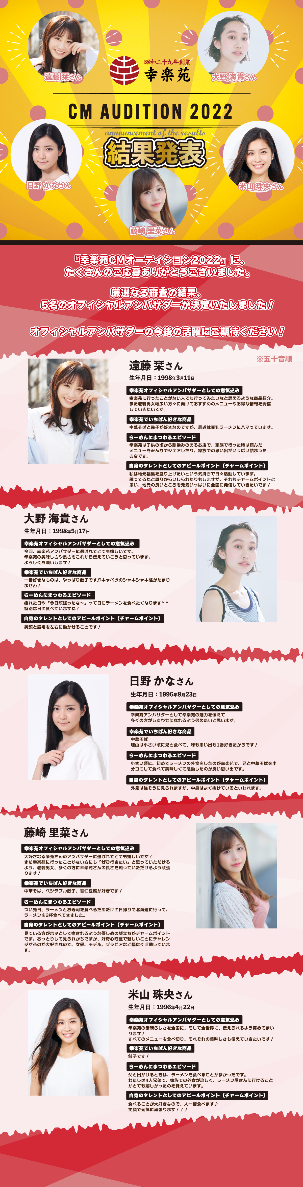 SNSでCMに出演できる「幸楽苑CMオーディション2022」 おいしさをまっすぐに伝える「幸楽苑オフィシャルアンバサダー」の5名が決定!