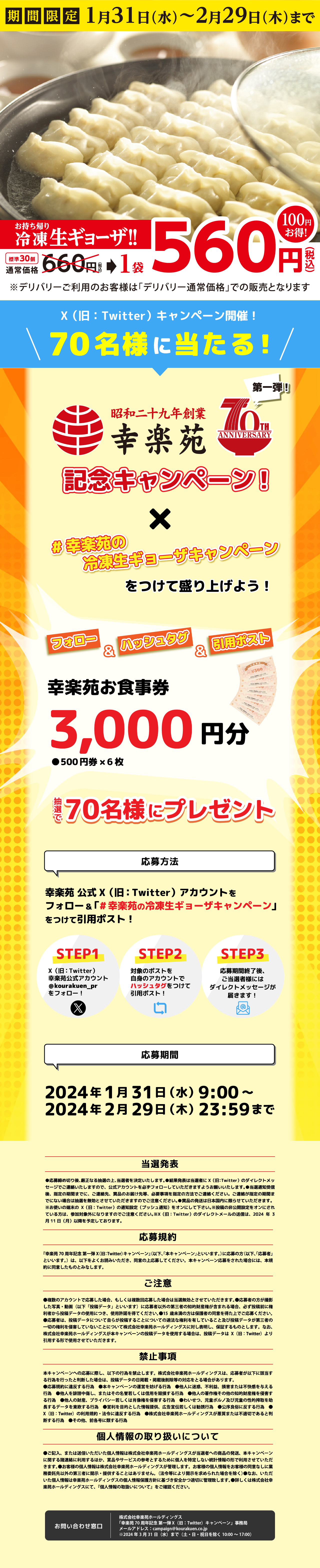 幸楽苑70周年記念 第一弾X(旧Twitter)キャンペーン!! 70名様に3,000円分のお食事券プレゼント!!