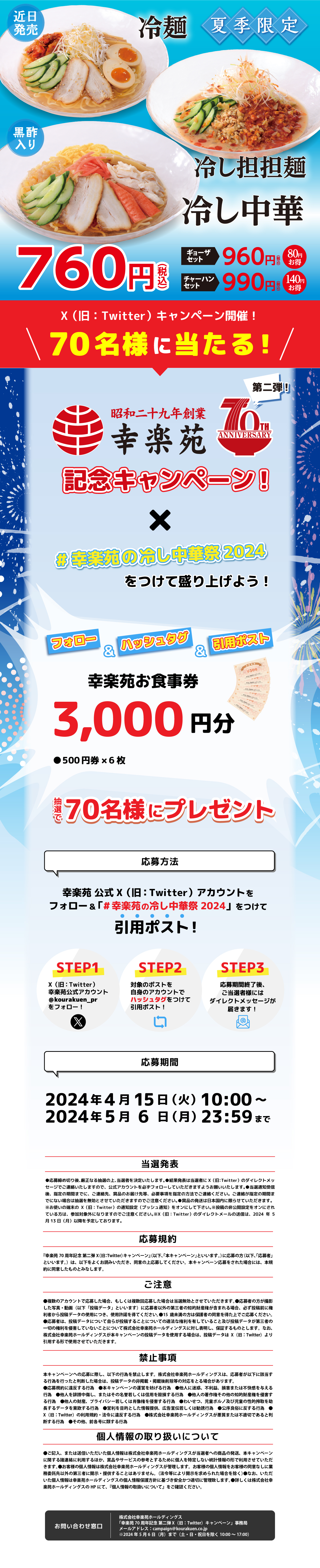 幸楽苑70周年記念 第二弾X(旧Twitter)キャンペーン!! 70名様に3,000円分のお食事券プレゼント!!