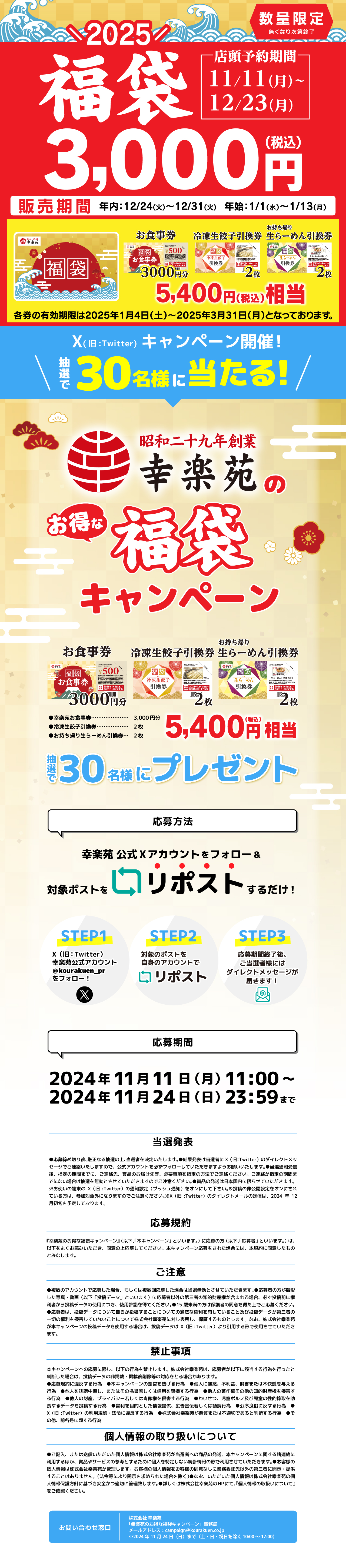 30名様に「福袋」が当たるXキャンペーン 2024年11月11日(月)~11月24日(日)まで開催!!